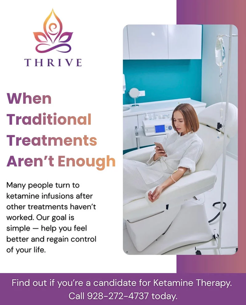 At Thrive Mental Health & Wellness, we offer evidence-based ketamine therapy designed to help individuals break free from the symptoms of treatment-resistant depression, anxiety, and PTSD. By working on the brain’s glutamate system and supporting neuroplasticity, ketamine can create rapid, lasting changes in mood and emotional well-being. Choose from IV infusion or intramuscular (IM) ketamine—the path forward is personalized, safe, and clinically guided.